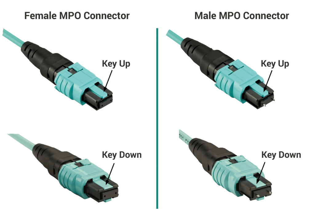 Любой MPO/MTP-разъем имеет ключ, определяющий его ориентацию "верх-низ", и два отверстия/штифта для точного совмещения.