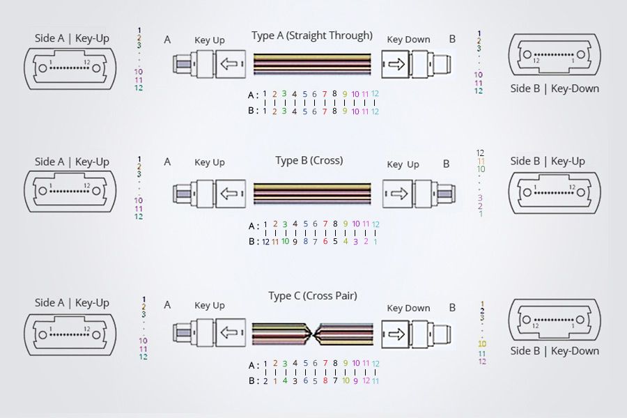 Стандарт TIA-568 определяет три классических метода организации полярности с помощью патч-кордов MTP-MTP. Тип A (Прямой метод, "Straight-through")
